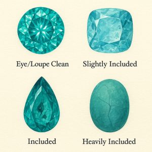 The visual aid above illustrates the main clarity categories you’ll encounter when assessing gemstones: Eye/Loupe Clean, Slightly Included, Included, and Heavily Included. Each type tells a story about how the gemstone formed and can influence not only its appearance but also its value.